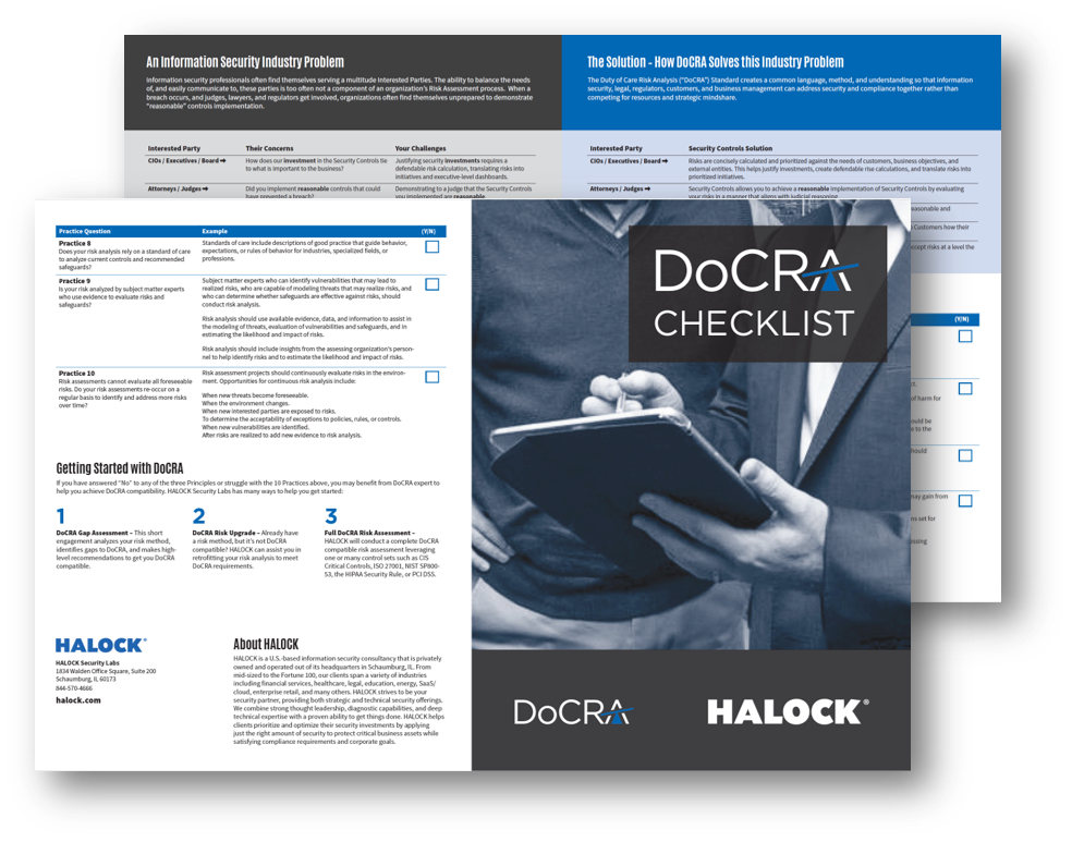 The DoCRA standard helps companies establish reasonable security strategies that incorporate their mission, objectives, and social responsibility. And the first step is to determine what risks your organization may have. A good start is to leverage the DoCRA Checklist, that helps assess your duty of care, and contact HALOCK to scope and quote a risk assessment. Prepare for the changing regulatory environment with a balanced look at your security and privacy safeguards.